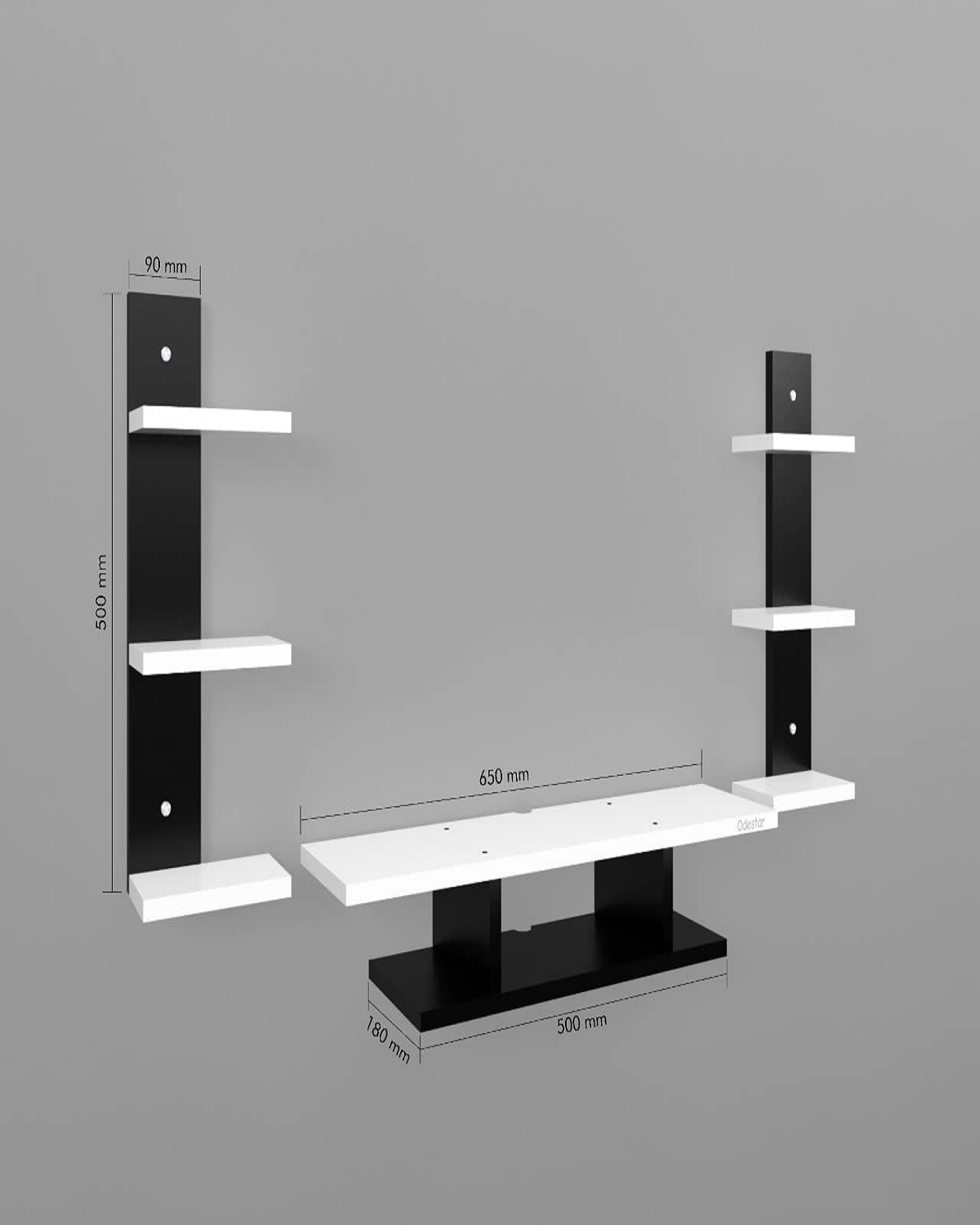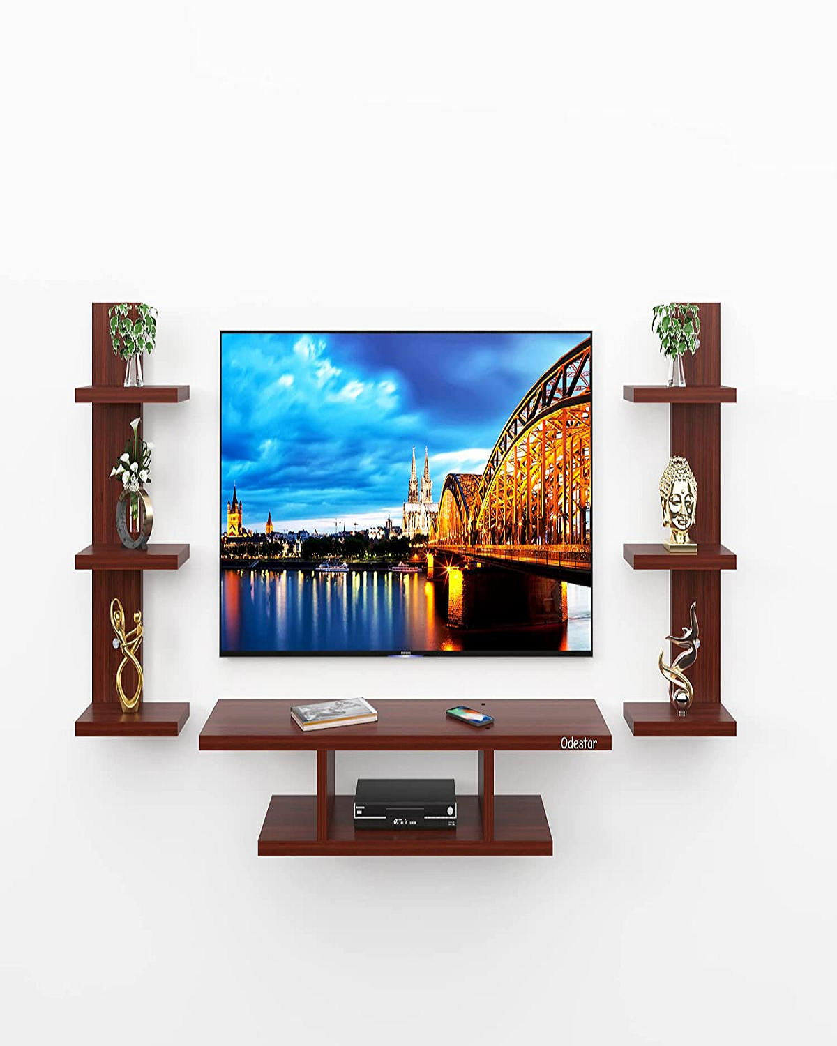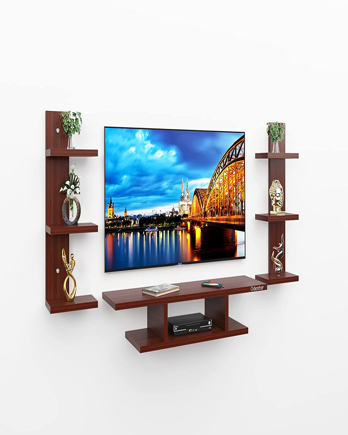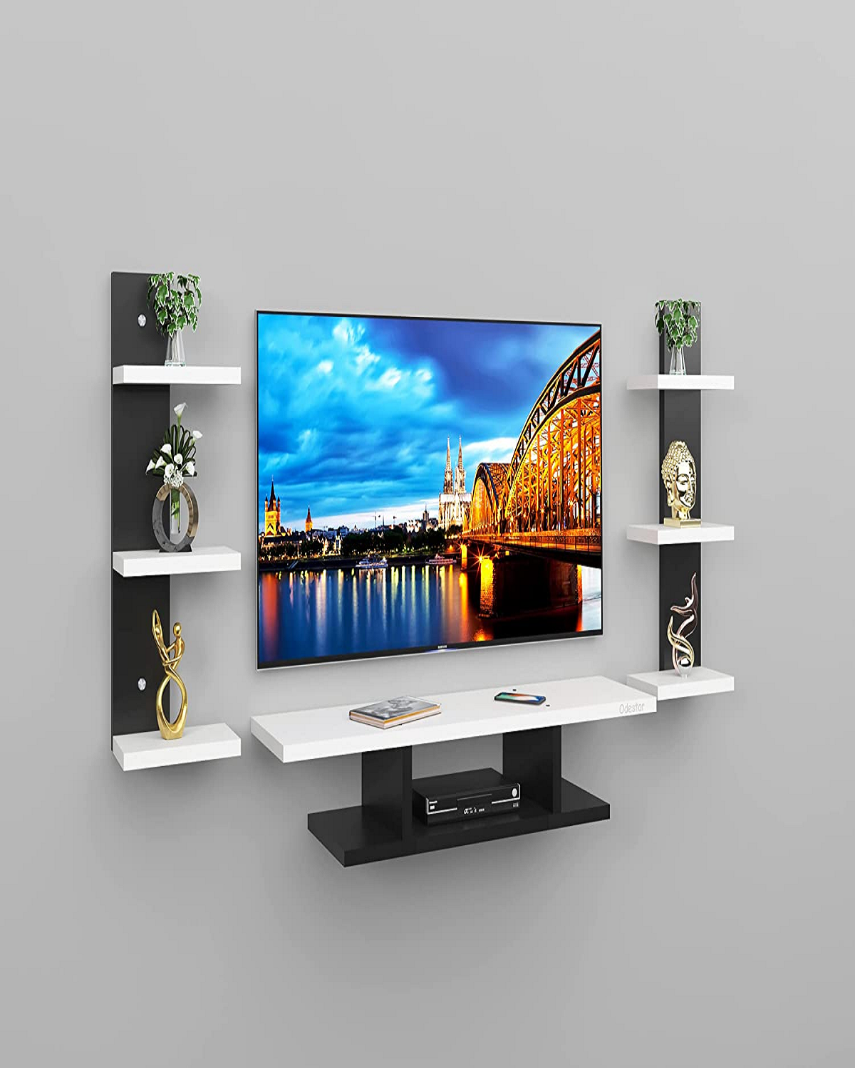 - SPACE SAVING - Large Countertops Ensure Ample Storage Space. Wall-Mount Design Doesn’t Take Much Space and Frees Up Valuable Floor Space. The Middle Compartment is Intended to Keep Your Set-Top Box While Books, Decorative Items & 4 Fully Functional Floating Open Shelves for Organize and Display Your Decorative Objects.